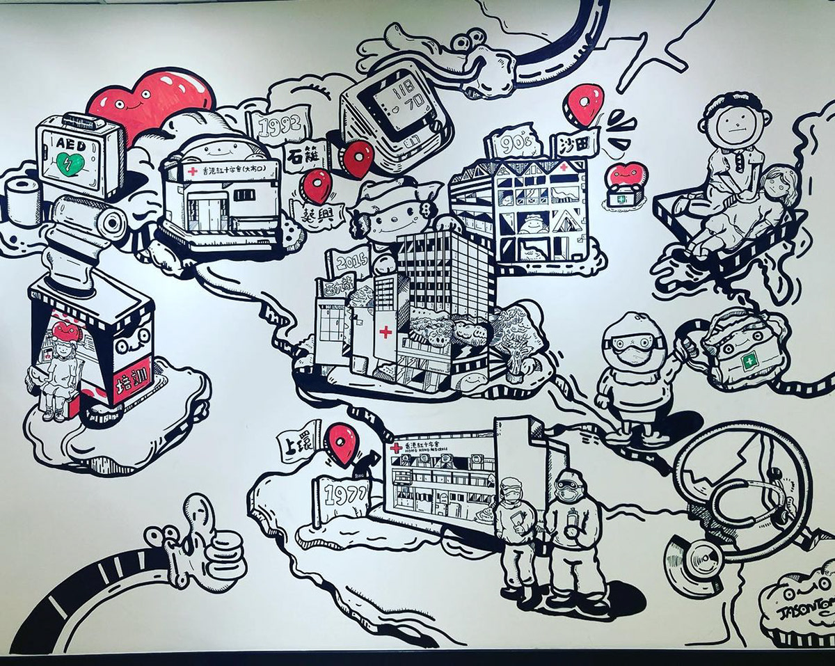 感謝紅十字會邀請,創作牆畫表現三十年來中心扎根香港的歷史變遷!同時加入不同急救角色及培訓細節。